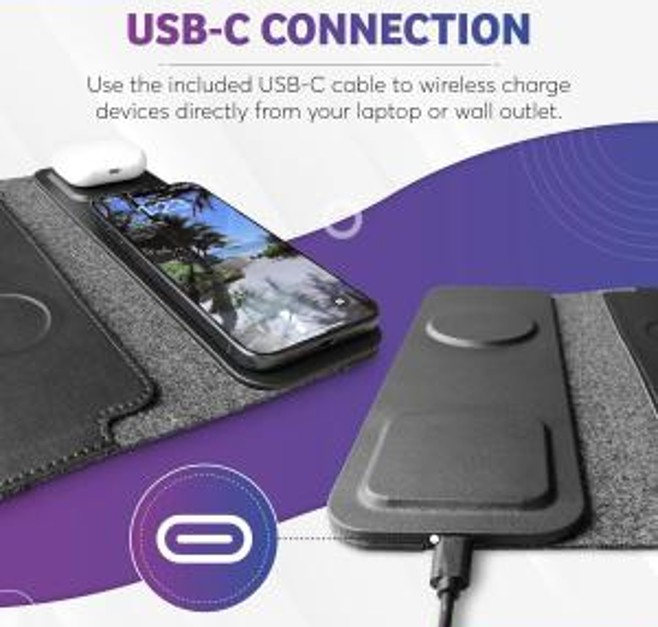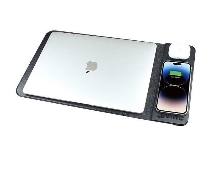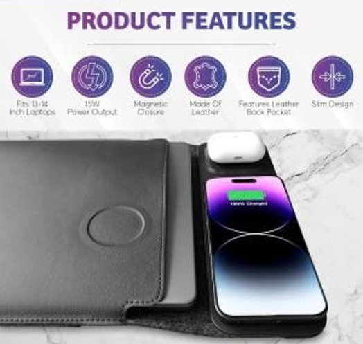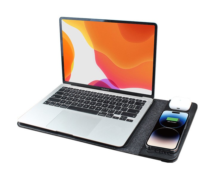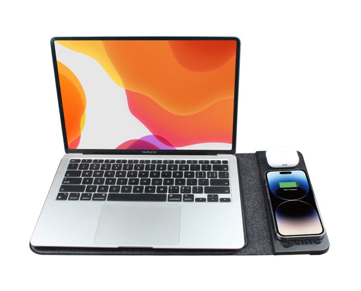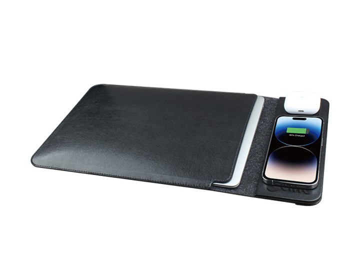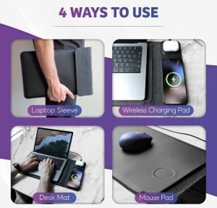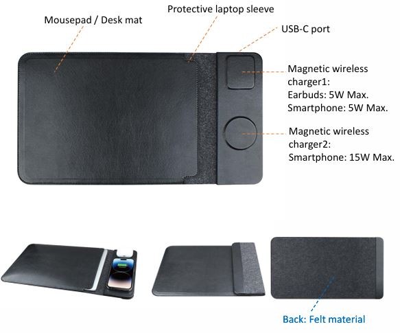 Upgrade your workspace with this multifunctional 3-in-1 laptop sleeve that doubles as a desk mat and mouse pad. Designed for 13–16 inch laptops, it features premium PU leather with a soft felt back for durability and elegance.⚡ Equipped with dual magnetic wireless chargers (20W max), it powers both your smartphone (iOS & Android) and wireless earbuds simultaneously via a USB-C fast charge port. The slim design and magnetic closure keep your laptop secure, while the fold-flat function turns it into a portable workstation anytime, anywhere.