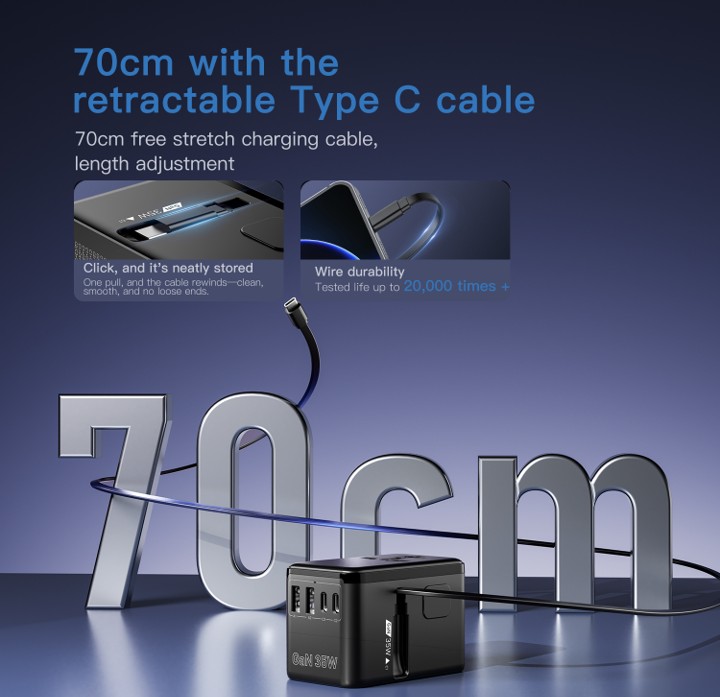 35W GaN Fast Charging – Equipped with GaN III technology for efficient, low-heat, and high-speed power delivery across 3 Type-C + 2 USB-A ports.🧳 Built-in 70cm Retractable Type-C Cable – Smooth, tangle-free cable with 20,000+ pull lifespan, perfect for travel efficiency.